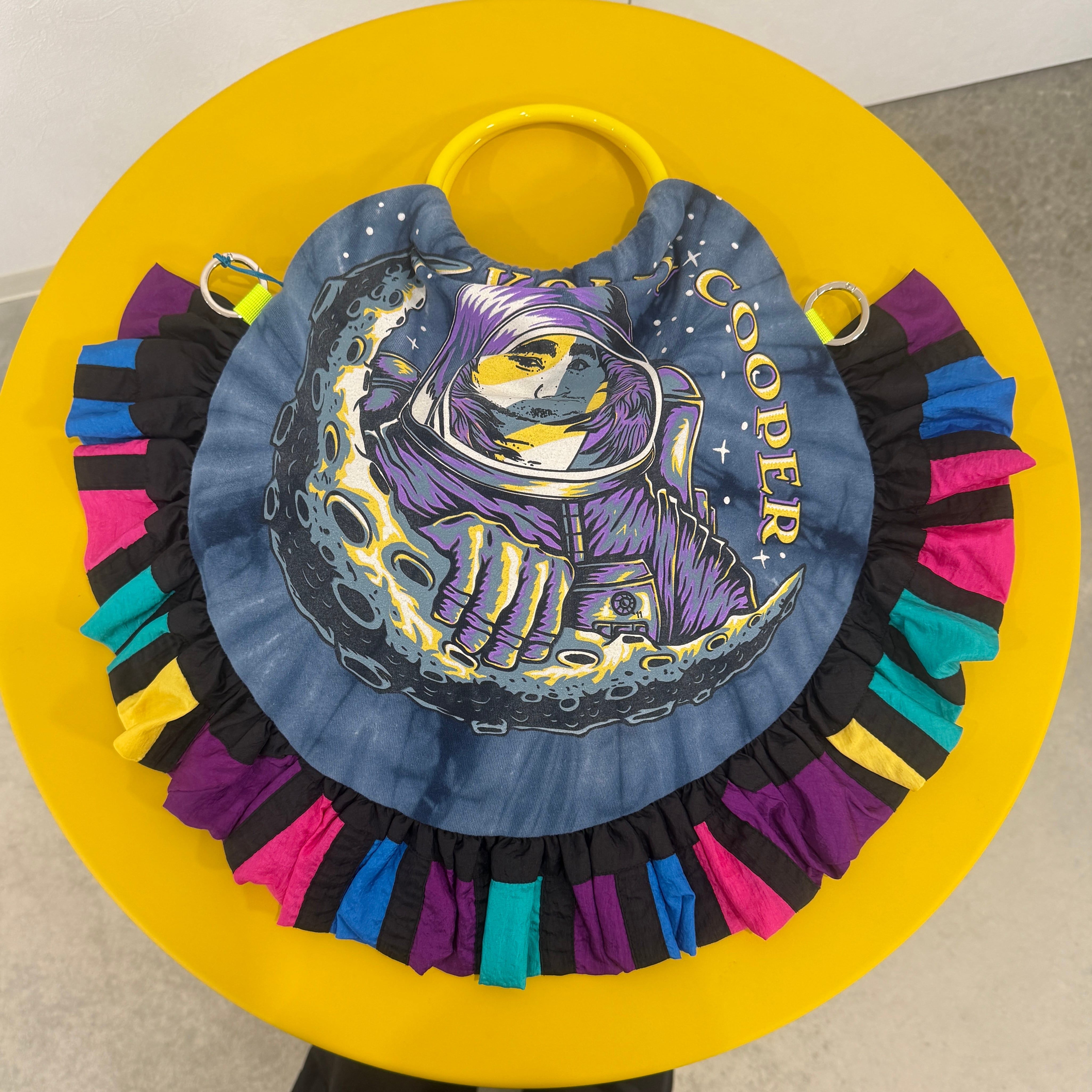 フリルには古着のスキーウェアやナイロンブルゾンを解き、